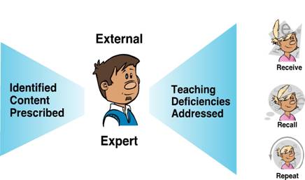 This initial professional development provided, where external experts delivered preconceived learning events to specifically address their understanding of the identified deficiencies in teachers knowledge, did not fully acknowledge teachers held views of teaching and learning and ICT that would be resilient and resistant to change (Gilbert 1993). This centrally controlled broadcasting of learning events followed what could be considered a ‘deficit' model of professional development (Clayton, Elliott & Saravani 2009a). This deficit model is illustrated in Figure 1 below.