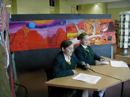 Finally, Katie and Louise present the story “Mars, Lost and Found” live to Glenn LTP, against a backdrop of art work, also added as part of the cross-curricular studies at Holy Cross. Students used pastels, paint, and collage, and worked in groups of six.