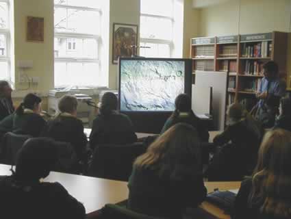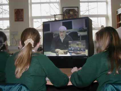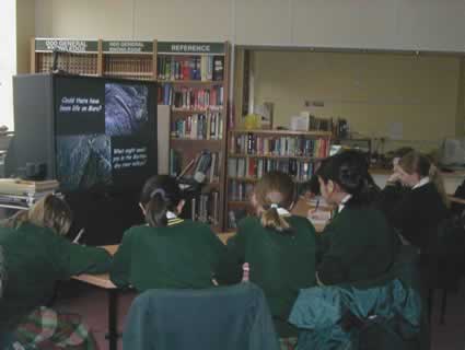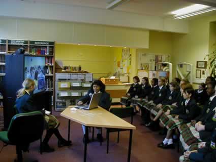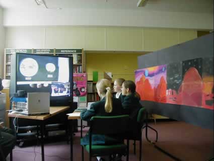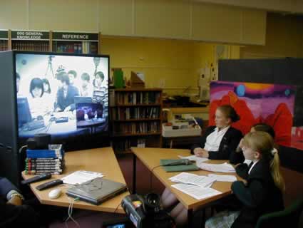 This slide captures much of the process. Behind Louise, Katie and Emily is the Art work. They are reading Katie’s word-processed science fiction story, “ Mars Lost and Found”. The video-conference camera is on top of library books (also used). On-screen are Ruth and Joe, listening to the story (our outgoing picture of the girls is on the “inset screen”). In Japan and in the USA, students are also listening, live and the story is also being webcast. On the table, left, are the mouse to operate the laptop (which showed JPEGs of the work at Holy Cross; the TV controller; and the VC camera controller. At the front of the picture is a movie camera, to record the event.
